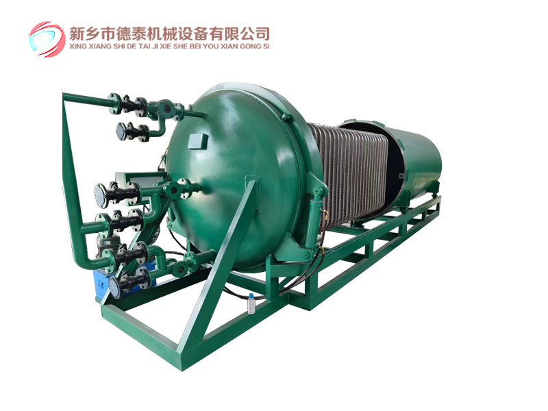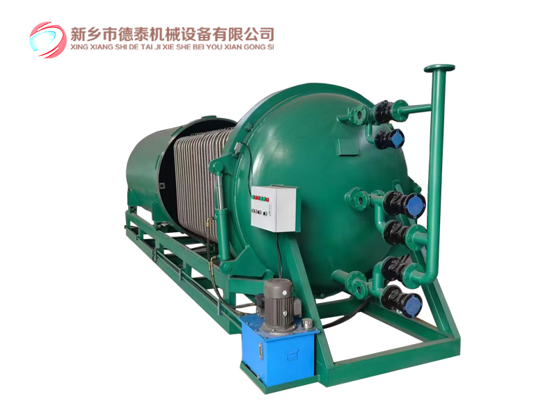 將待濾液通過泵輸入到過濾機(jī)內(nèi)部并打滿,當(dāng)濾液在過濾機(jī)內(nèi)部和攪拌罐之間循環(huán)一段時間后,雜質(zhì)在濾板表面形成濾餅層,液體開始變清,這時候開始進(jìn)行過濾。隨著過濾量的增加,濾餅厚度增加,罐內(nèi)壓力升高,當(dāng)壓力達(dá)到0.45MPa,停止進(jìn)液,關(guān)泵,打開空氣閥門,開始采用空氣或者蒸汽進(jìn)行吹餅,餅吹干以后關(guān)閉進(jìn)氣閥門,當(dāng)罐內(nèi)壓力為零時,啟動液壓裝置,打開封頭,使筒體拉出,開啟振動體振動卸渣,卸渣完畢,關(guān)閉液壓開關(guān),筒體復(fù)位,進(jìn)行下輪過濾;對于粘度較大的濾餅,需要人工進(jìn)行清渣。