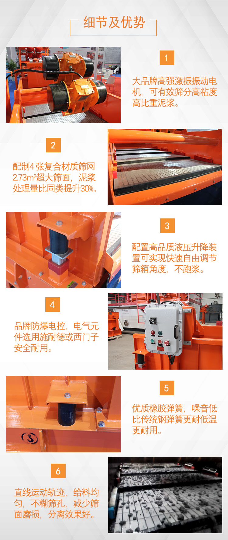 配置高品質(zhì)升降裝置可實(shí)現(xiàn)快速自由調(diào)節(jié)篩箱角度,防止浪費(fèi)泥漿。