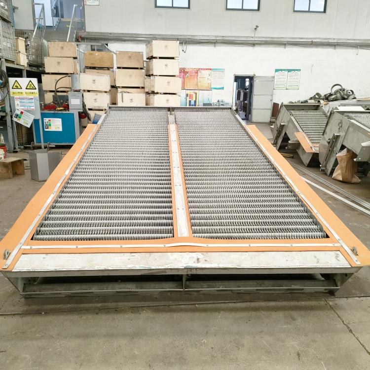 機(jī)械格柵是可以連續(xù)自動(dòng)清除的格柵。它由許多個(gè)相同的耙齒機(jī)件交錯(cuò)平行組裝成一組封閉的耙齒鏈,在電動(dòng)機(jī)和減速機(jī)的驅(qū)動(dòng)下,通過一組槽輪和鏈條組成連續(xù)不斷的自上而下的循環(huán)運(yùn)動(dòng),達(dá)到不斷清除格柵的目的。當(dāng)耙齒鏈運(yùn)轉(zhuǎn)到設(shè)備上部及背部時(shí),由于鏈輪和彎軌的導(dǎo)向作用,可以使平行的耙齒排產(chǎn)生錯(cuò)位,使固體污物靠自重下落到渣槽內(nèi),脫落不干凈時(shí),這類格柵容易把污物帶到柵后渠道中。鋼絲繩牽引卷筒機(jī)械格柵工作時(shí)鋼繩驅(qū)動(dòng)裝置放繩,耙斗從頂點(diǎn)位置(上一循環(huán)撇渣結(jié)束處)沿導(dǎo)軌下行,撇渣板在自重的作用下隨耙斗下降。當(dāng)撇渣板復(fù)位后,耙斗在開閉耙裝置(電動(dòng)推桿)的推動(dòng)下通過中間鋼繩的牽引張開并繼續(xù)下行直至抵達(dá)渠道下限位,待耙齒插入格柵間隙后,鋼繩驅(qū)動(dòng)裝置收繩,進(jìn)一步強(qiáng)制耙斗閉合后耙斗和斗車沿導(dǎo)軌上行,清除柵渣直至觸及撇渣板,在兩者相對運(yùn)動(dòng)作用下,柵渣被撇出,經(jīng)導(dǎo)渣板落入渣槽,完成一個(gè)工作循環(huán)。