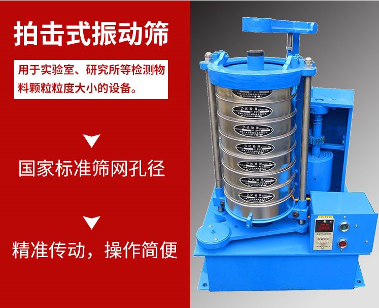 拍擊篩(拍擊式標準振篩機)分多種特性的產品。適用于普通磨料粒度組成檢查、超硬材料生產分級及料度組成檢查,亦廣泛應用于地質、冶金、粉體、化工、建工、水泥、醫藥、國防等部門科研、生產、實驗室,對物料進行篩分檢測。