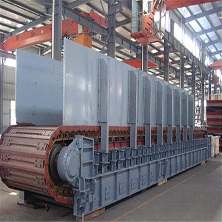 板式給料機組成結構: 板式給料機由牽引鏈、承載鏈板、鏈輪、機架、驅動裝置組成。 板式給料機特點: 1、牽引鏈采用長節距板式銷軸滾子鏈,鏈條各零件均采用合金鋼材料,并經科學的熱處理,耐磨性能好,抗拉強度高、使用壽命長。 2、采用沖壓槽體,中間用橫筋加強、槽體剛性好,承載能力大。槽體底板圓弧搭接,防止物料泄漏。 3、驅動電機采用調速電機,運行速度可調,以便更合理地選擇輸送量。 4、布置形式多樣、可水平、傾斜布置,還有多種水平、傾斜組合布置。 5、單機輸送長度小于等于60m,物料溫度小于等于600℃,提升高度小于等于30m。