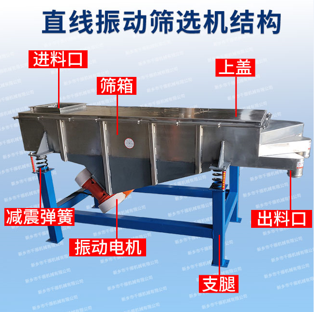 直線振動篩選機主要由篩箱、篩框、篩網、振動電機、電機臺座、減振彈簧、底座支腿、進料口、出料口、上蓋等組成。