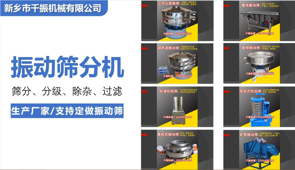 新鄉市千振機械有限公司是直線篩、直線振動篩、圓形振動篩、超聲波振動篩、旋振篩、搖擺篩、直排振動篩、試驗篩、標準檢驗篩、陶瓷中頻高頻振動篩、礦用振動篩等振動篩分設備的核心制造廠家,現貨供應、交貨快,質量之選、價格之選、睿智之選。