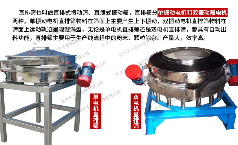 新鄉市千振機械專業生產直排振動篩設備,振動篩分行業經驗16年,直排振動篩又叫做直排式振動篩,下出料口直泄式設計,用于粉末、顆粒除雜用,篩上物占比少,直排振動篩處理量大,可以和其他設備連接使用,適合流水線工作。