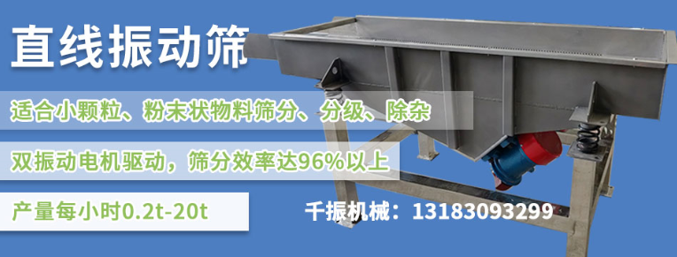 千振機械直線振動篩適合篩分的物料,直線篩篩分產量大,一小時0.2-20噸,雙振動電機驅動。 千振機械直線振動篩適合篩分的物料,各行各業粉末、顆粒篩分、分級、除雜、過濾均可用直線振動篩設備。