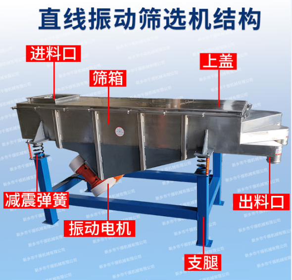 直線篩利用振動電機激振作為振動源,使物料在篩網上被拋起,同時向前作直線運動,物料從給料機均勻地進入篩分機的進料口,通過多層篩網產生數種規格的篩上 物、篩下物、分別從各自的出口排出。具有耗能低、產量高、結構簡單、易維修、全封閉結構,無粉塵溢散,自動排料,更適合于流水線作業。