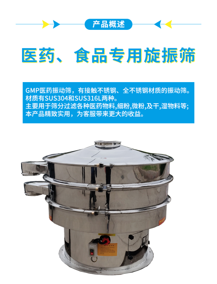 GMP醫藥振動篩,全不銹鋼振動篩,單層藥粉篩,800型不銹鋼篩粉機-醫藥行業振動篩一般為全不銹鋼材質,材質分為:SUS304和SUS316L兩種。一般是根據醫藥物料的各種特性和處理量來選擇使用哪一種振動篩更合適,醫藥振動篩是我廠在吸收國內外先進技術基礎上,根據多年對各種醫藥物料的試驗,專業設計出的具有國內先進水平的特殊性,高粘度,細粒物料篩分過濾設備.主要用于篩分過濾各種醫藥物料,細粉,微粉,及干,濕物料等;本產品精致實用,專業的物料配專業的設備會給客戶帶來更大的收益. 宏源旋振篩根據用戶需要而設計制造特殊型號規格的篩機.旋振篩應用十分廣泛,從醫藥原料的篩選到醫藥中間體的過濾篩分都需要用到振動篩分設備,用在醫藥行業的振動篩的材質要求十分嚴格,必須達到制藥行業的GMP生產標準,振動篩所采用的橡膠配件都必須達到食品級衛生標準.與物料接觸部分必須是304不銹鋼振動篩,有的要求是全不銹鋼振動篩,振動源一般無要求時用的是一般的三相異步振動電機,有立式振動電機和臥式振動電機,工作場所有防塵,防爆要求的還需要用到防爆振動電機。