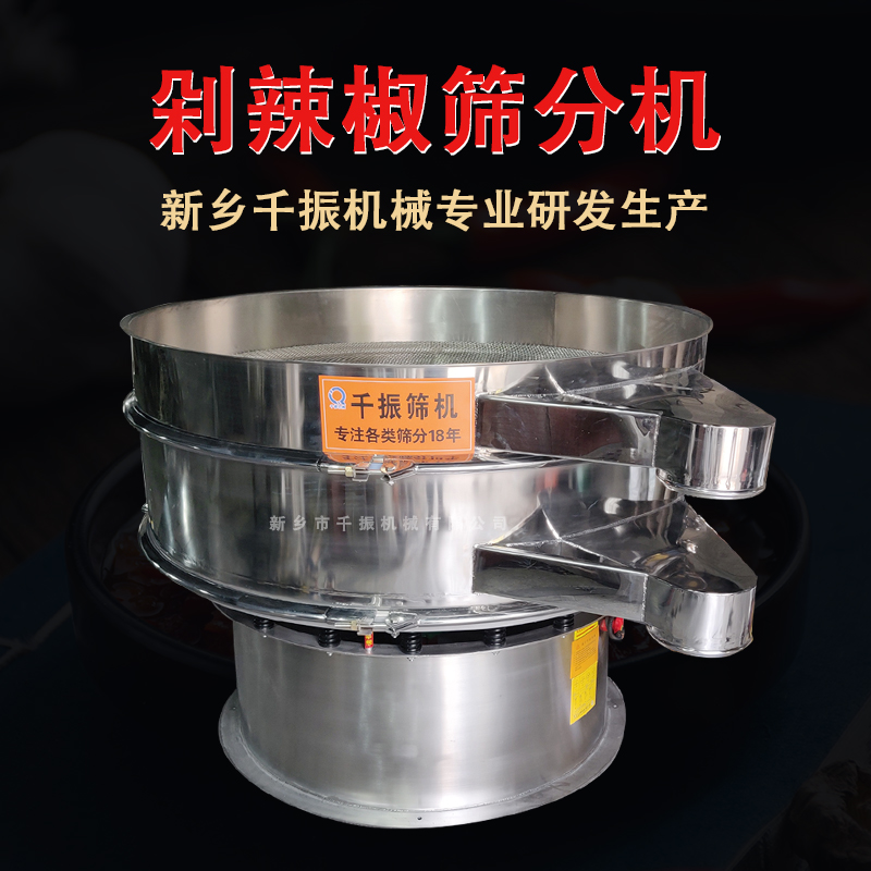 1,剁辣椒有著增進食欲的功效,對于味蕾比較差、不愿意吃飯、食欲下降的人,適當的食用剁椒,可以通過刺激味蕾而達到增進食欲、促進消化的功效。, 2,剁辣椒還有著很好的除濕的作用,對于體內濕氣較重所導致的頭暈腦脹、四肢無力,適當的食用剁椒,可以通過除去體內的濕氣而達到緩解上述癥狀的功效。 3,剁辣椒還能夠為機體補充一些維生素,尤其是維生素C的含量相對來說較高,而維生素C能夠很好的清除自由基,可以抗氧化、抗衰老,因此適當的食用剁辣椒也有著一定的美容養顏的功效。 湖南剁辣椒碎振動篩選機 1.2米不銹鋼剁辣椒旋振篩 千振機械剁辣椒振動篩選機設備是千振公司根據辣椒特有特性設計研發的一款干辣椒推薦篩分設備,其噪音低、效率高,全封閉結構,適用于辣椒塊或片的篩分過濾。千振機械干椒振動篩是由直立式電機作激振源,電機上、下兩端安裝有偏心重錘,將電機的旋轉運動轉變為水平、垂直、傾斜的三次元運動,再把這個運動傳遞給篩面。調節上、下兩端的相位角,可以改變辣椒在篩面上的運動軌跡。