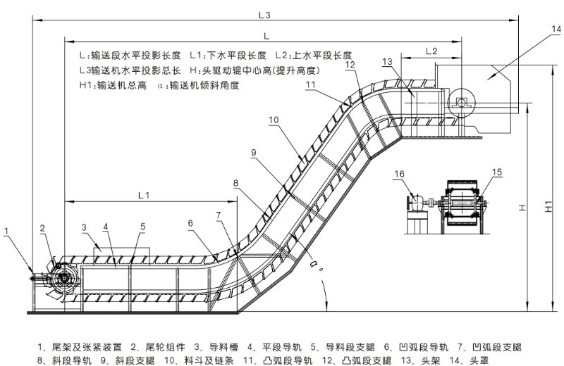 DS型連續斗式輸送機(簡稱鏈斗機)適用于水平或傾斜輸送各種粉狀和塊狀散料,諸如水泥、熟料、鐵渣、礦砂、石灰石、焦炭等??稍诮ú?、冶金、煤炭、化工、電力及國民經濟的其它部門推廣應用。