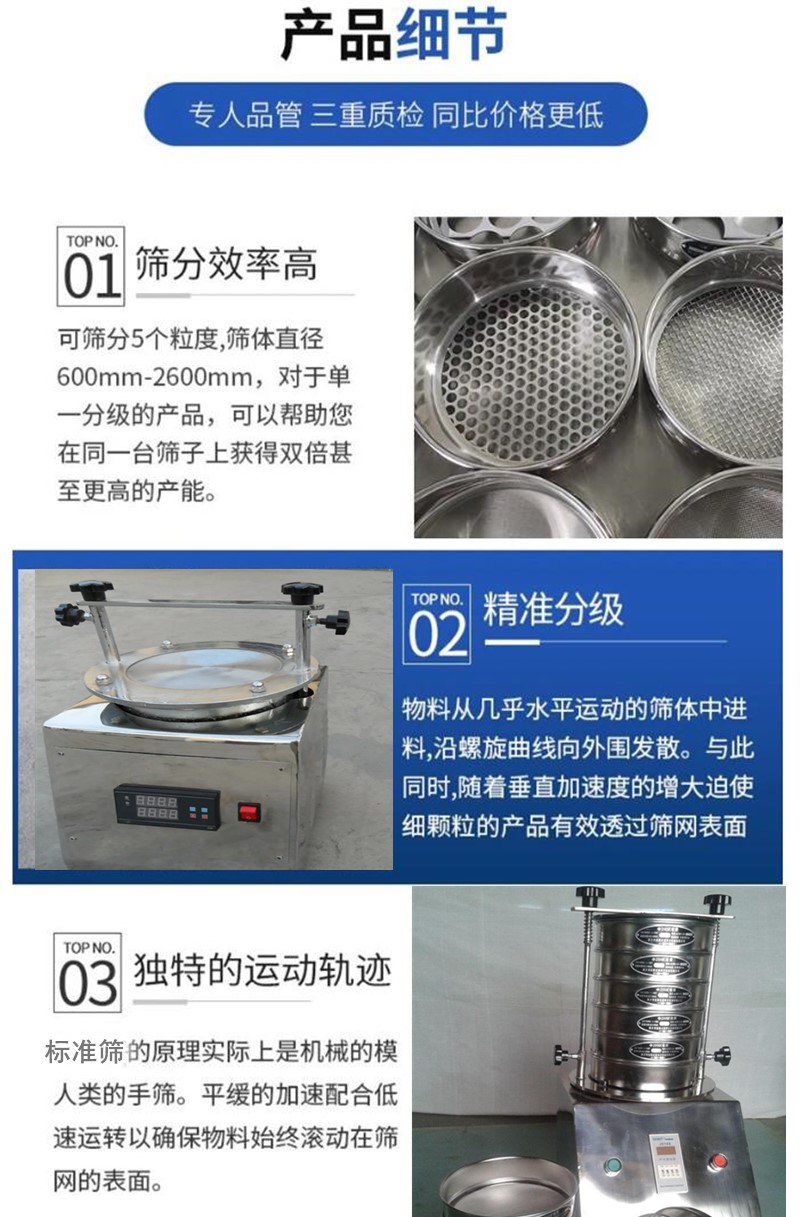 醫藥篩分機 地質 建材φ200標準篩 實驗篩 振動篩廣泛應用于各科研院所、大專院校、環保、商檢質檢、海關、農業、冶金、藥廠等單位,實驗篩又稱檢驗分析篩,檢驗篩,產品結構緊湊、噪音低、效率高精度準確等特點突出,采用新型動力發生器,產生多元高頻振動,對物料進行篩選、測定。同時可根據不同物料來通過時間繼電器實現不同的工作時間,把檢驗誤差降到非常低的程度,保證樣品分析數據的一致性,對產品質量做出判斷。