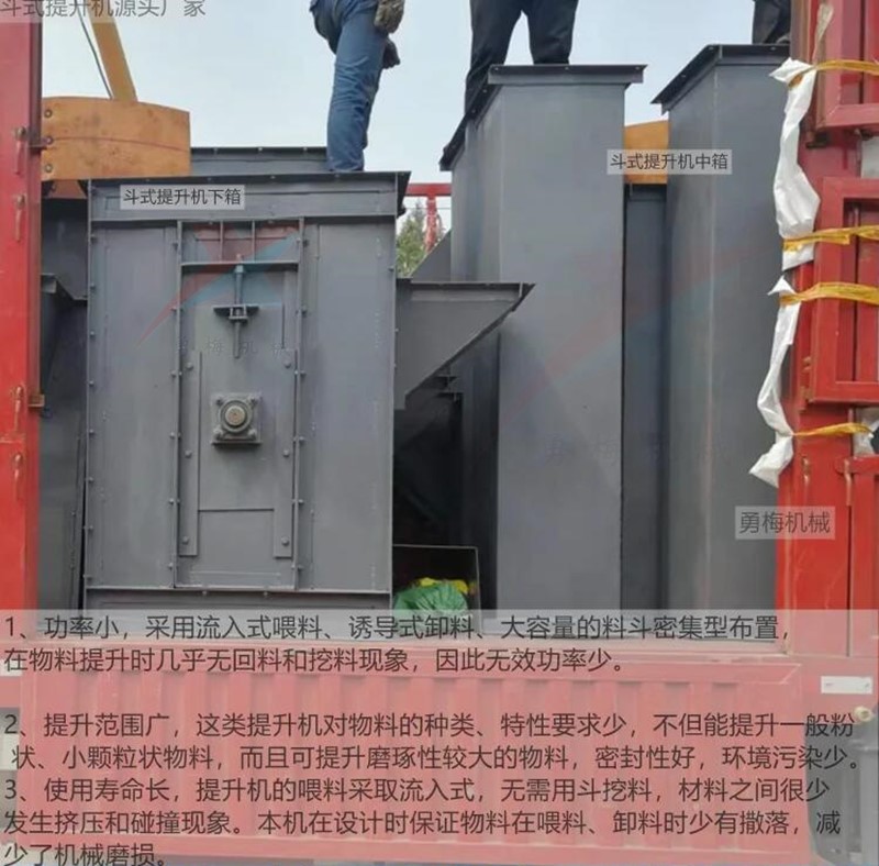 垂直輸送粉狀粒狀物料斗式提升機  砂石斗式提料機的設計原理和加工方法,保證了整機運行的可靠性,無故障時間超過2萬小時。提升高度高.提升機運行平穩,因此可達到較高的提升高度。提升機的喂料采取流入式,無需用斗挖料,材料之間很少發生擠壓和碰撞現象。本機在設計時保證物料在喂料、卸料時少有撒落減少了機械磨損。采用流入式喂料、誘導式卸料、大容量的料斗密集型布置,在物料提升時幾乎無回料和挖料現象,因此無效功率少。