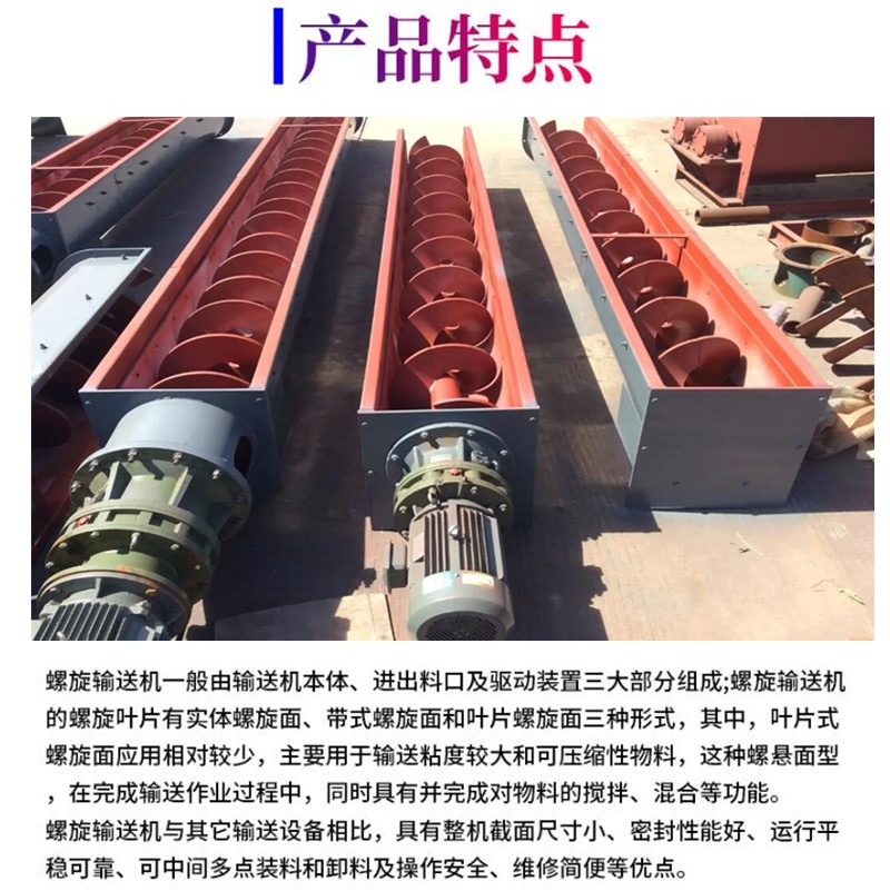 污水處理管式螺旋輸送機 泥巴石頭螺桿推送機是一種利用電機帶動螺旋回轉,推移物料以實現輸送目的的機械。它能水平、傾斜或垂直輸送,具有結構簡單、橫截面積小、密封性好、操作方便維修容易、便于封閉運輸等優點。螺旋輸送機在輸送形式上分為有軸螺旋輸送機和無軸螺旋輸送機兩種,在外型上分為U型螺旋輸送機和管式螺旋輸送機。有軸螺旋輸送機適用于無粘性的干粉物料和小顆粒物料;(例如:水泥、粉煤灰、石灰等)