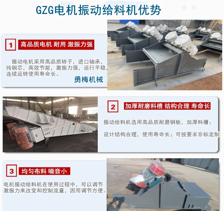 煤礦 礦山用大型GZD振動給料機 振動給礦機沒有復雜的傳動部件和旋轉部件,主要由給料槽、振動電機、支撐裝置等組成,整體結構簡潔,占地面積小,勇梅機械振動給料機能輸送各種小塊狀、顆粒狀及粉狀物料,也可輸送高溫、有毒等非常規物料,還可輸送傳統有軸螺旋輸送機和皮帶輸送機不能或不易輸送的物料,如濕的和糊狀物料、半流體和粘性物料等。