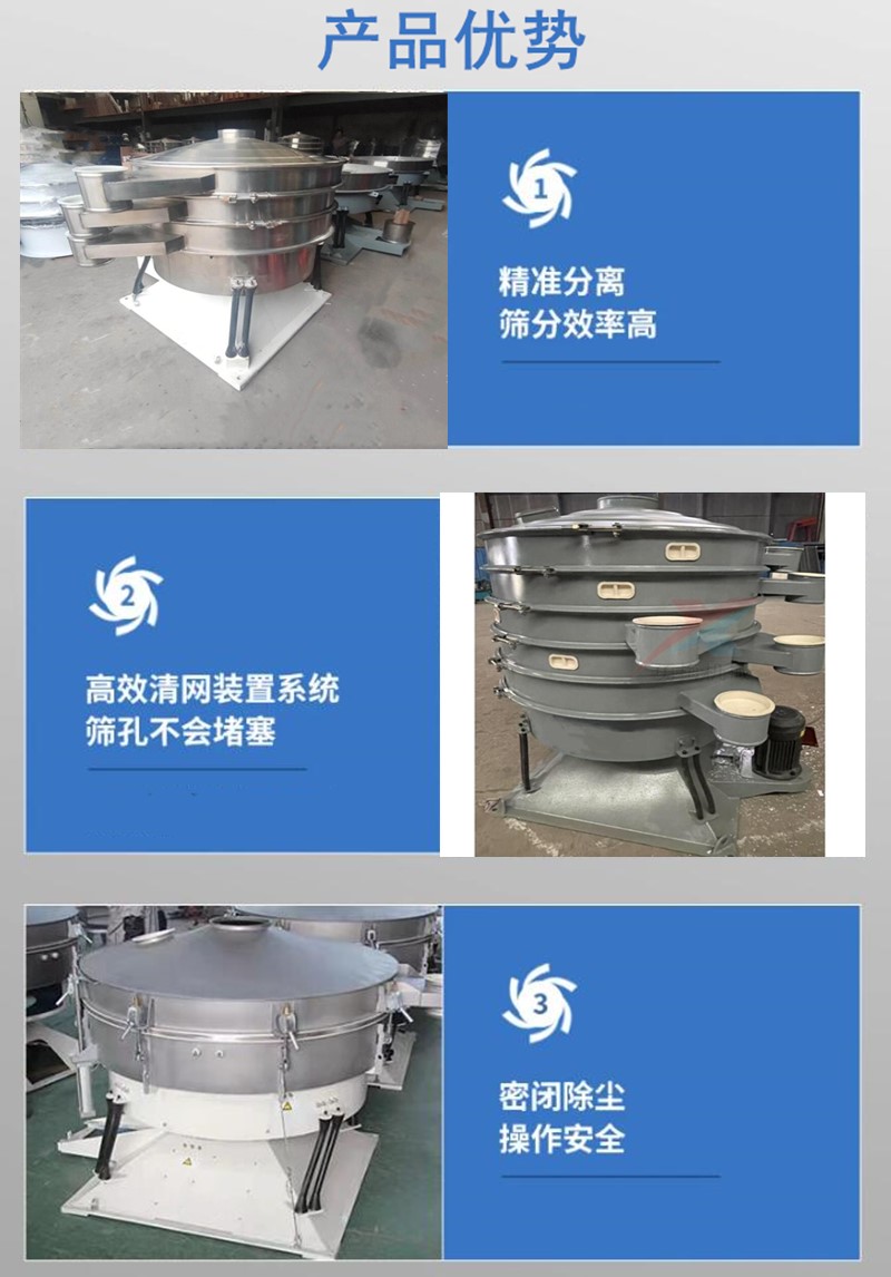 密閉除塵圓形搖擺篩分機 粉料顆粒物料高精度振動篩產量是普通振動篩的5-10倍,適合精細粉末、圓球狀、片狀機不規則狀等易堵塞物料,不存在高速振動,減少對物料的損壞。