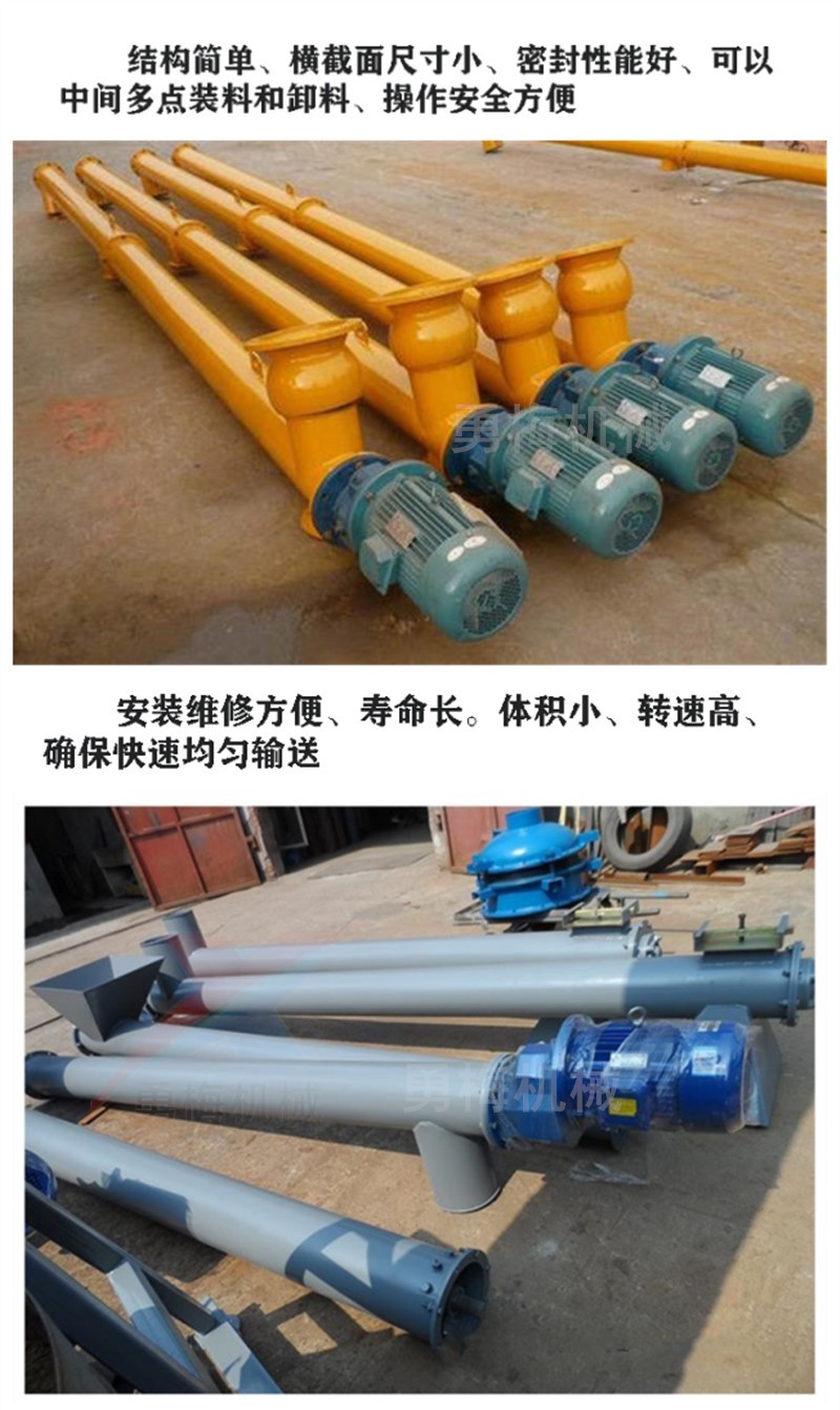粉煤灰絞龍提升上料機 螺旋式輸送機由于沒有中間軸承,對于輸送帶狀、黏稠物料易纏繞物料有特殊的優越性,能避免物料堵塞。絞龍上料機能輸送不同的小顆粒物料,包括粉末、顆粒、塊狀物料。如水泥、灰土、糧食、煤礦等。螺旋輸送機是一種利用電機帶動螺旋回轉,推移物料以實現輸送目的的機械。它能水平、傾斜或垂直輸送,具有結構簡單、橫截面積小、密封性好、操作方便、維修容易、便于封閉運輸等優點。