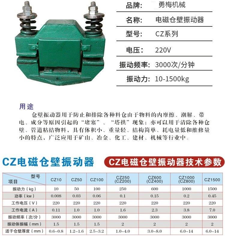 噪音低激振力強CZ800電磁倉壁振動器是靠高頻振動和沖擊力,有效地消除物料由于內摩擦、潮解、帶電、成份偏析等原因而引起的堵塞、起拱現象,使物料從料倉口順利排出,保證穩定地供科所必需的設備。