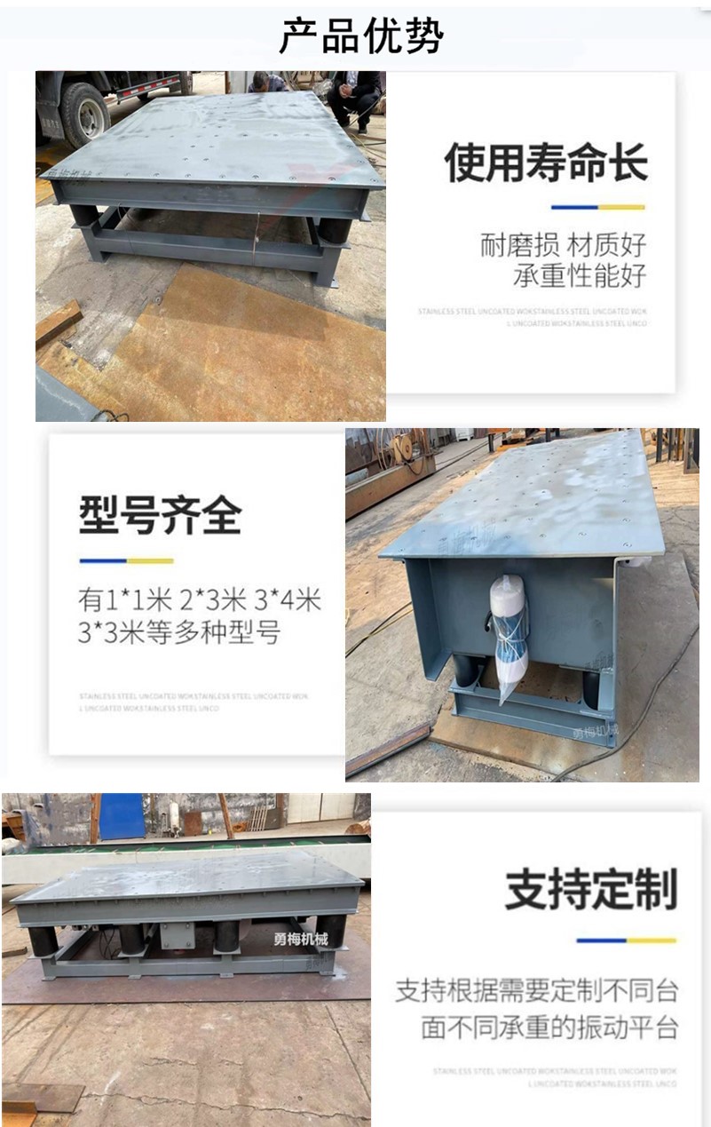 預制水溝蓋板振動平臺 人防門專用振實臺結構相對簡單,操作方便,操作人員只需將物料放置在臺面上,接通電源并調節相關參數即可開始工作。而且振動電機等部件的維護也比較簡單,降低了設備的維護成本,可定制性強:為非標產品,可根據客戶的不同需求進行定制,如臺面尺寸、承重能力、振動方式、振動頻率等,能夠滿足各種不同的生產工藝和生產規模的要求.