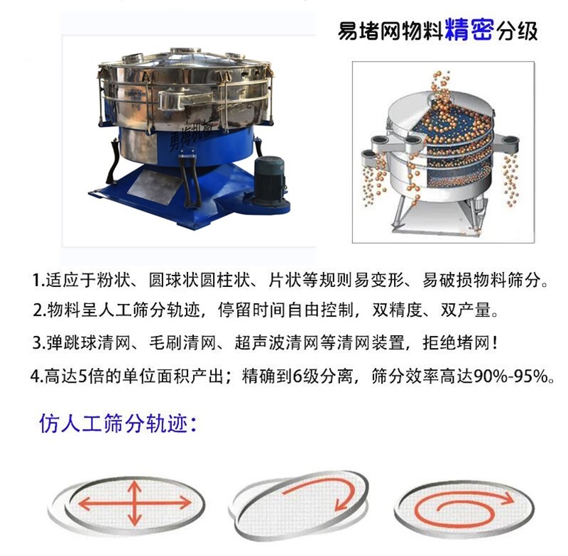 電動震動篩 粉末石英砂搖晃篩 玻璃纖維搖擺篩使用硅橡膠球、超聲波等**清網裝置系統。篩孔不會堵塞。密閉除塵,操作安全;加速度比振動篩低4.5倍。篩分零件壽命提高而維護減少,噪聲<75分貝。優化重理均衡,地基動態負荷低?;镜幕剞D運動與人工篩分相類似。偏心率從25到40MM可調。低速V型皮帶驅動從120到360RPM可調,每一種產品的停留時間可以通過搖擺篩的徑向與切角朝驅動軸線方向進行調整,因此建立水平與拋擲三維翻滾運動。物料從中心到外緣在整個篩面上均勻分散,從而以螺旋運動往軸向傳播。細小顆粒從而完成了整個篩分過程。