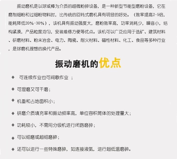 實驗室用小型振動磨機 磁性材料磨粉機是選礦、粉末冶金專業用得較多的破碎設備,廣泛適用于陶瓷、非金屬礦、顏料、電子、化工、冶金、建材、新型材料、食品和制藥等領域。它用于細碎,效率比一般球磨機高2倍,具有結構簡單、成本低等優點