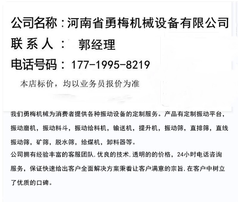 河南省勇梅機械設備有限公司位于新鄉市牧野區寺莊頂工業園內,是一家主營k型給煤機、斗式提升機、星型卸料器、振動磨機、振動平臺、振動料斗、振動篩、旋振篩、滾筒篩、直線振動篩、礦用振動篩、FU輸送機、螺旋輸送機、振動電機的廠家,產品廣泛銷售至化工、食品、鑄造、鋼廠、水泥、冶金、建材鐵等大中小型企業,并取得了良好的信譽。