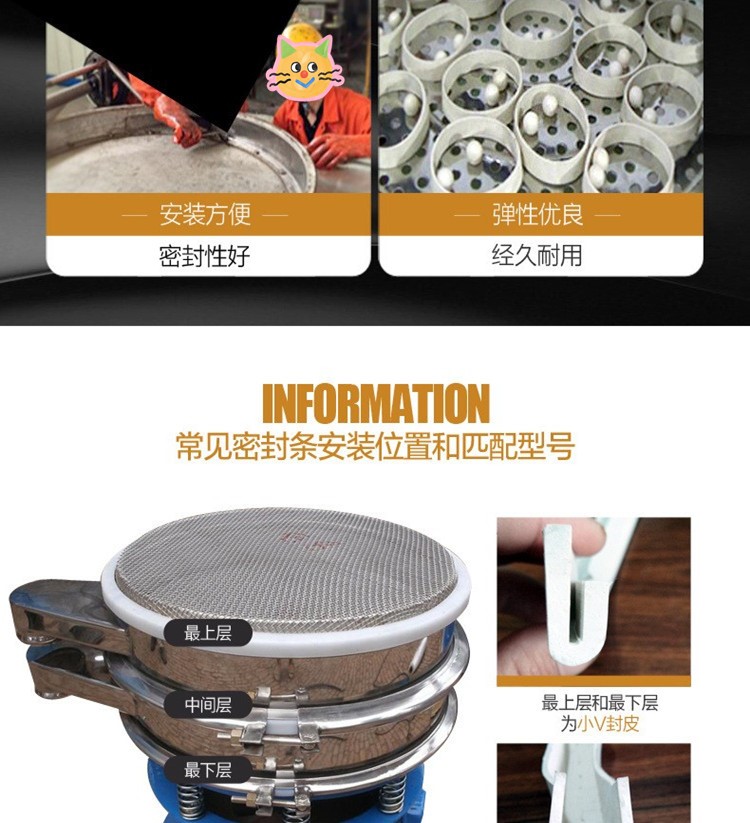 大U大V型橡膠密封條 旋振篩密封圈成本較低,性能穩定,彈性模量小,伸長率高,具有良好的彈性和抗壓縮變形能力,能適應一定程度的振動和變形。U 型密封條:以密封圈槽底為分界線,左右兩邊長度一致。主要用于子母網分離式網架與防塵蓋上面,起到密封、緩沖、防震、防滑、防塵等作用。V 型密封條:以密封圈槽底為分界線,左右兩邊長度不一致。主要安裝在振動篩的底框與振動體和振動篩上框與防塵蓋接觸部分,起到密封、緩沖、減震的作用。