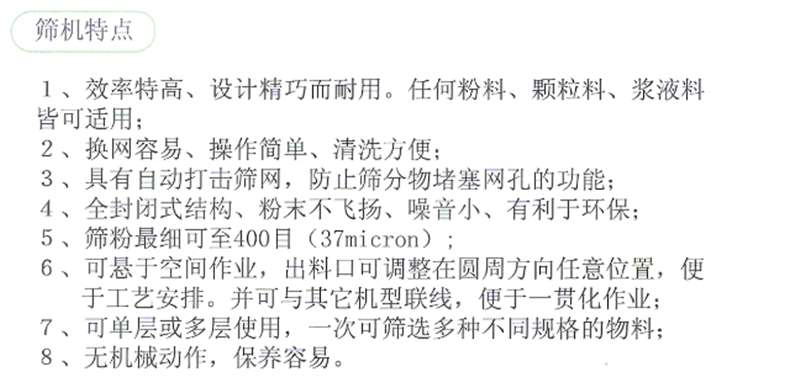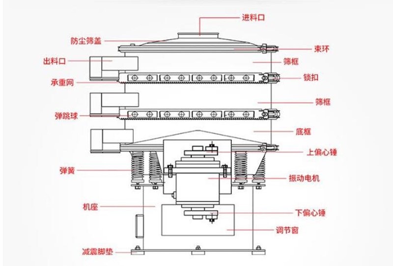結構組成 振動電機:作為旋振篩的動力來源,通過上下兩端的偏心重錘產生三次元運動。 篩框:用于支撐篩網,通常由不銹鋼或碳鋼制成,具有一定的強度和剛度,能夠承受振動和物料的沖擊。 篩網:是旋振篩的關鍵部件,根據篩分需求可選用不同材質和目數的篩網,如不銹鋼網、尼龍網、聚酯網等。 支撐彈簧:一般安裝在篩框與底座之間,起到支撐和緩沖的作用,使篩框能夠在振動電機的作用下平穩地振動。 出料口:位于篩框的邊緣,用于排出篩分后的物料,出料口的方向可根據實際需求進行調整。
