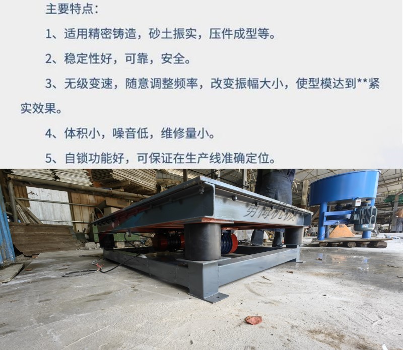 覆膜砂振動平臺 砂箱填充振動臺無級變速,17719958219 隨意調整頻率,改變振幅大小,使型模達到**緊實效果。體積小,噪音低,維修量小。自鎖功能好,可保證在生產線準確定位。振動平臺又叫振實臺,主要用于物料的震實,減少物料內的空氣和縫隙從散裝到塊狀、形狀等形式的轉變。根據生產特點和要求選用不同型號的振動臺。設備由機體和電控柜組成,機體由振動臺振動電機、減震彈簧、基座組成。振動平臺廣泛地使用在冶金,模具/食品、化工、建材等行業。