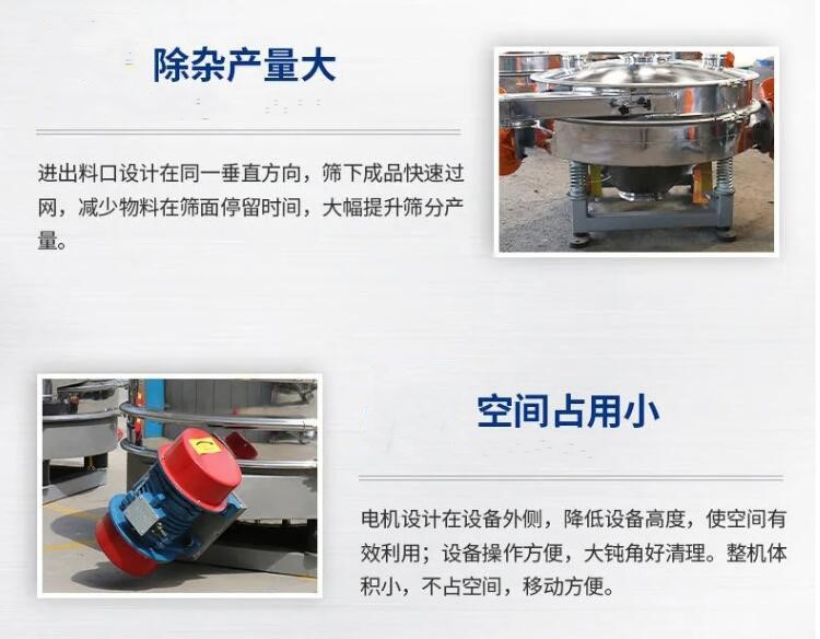 直排式篩粉機 不銹鋼直卸式振動篩出料口設計在同一垂直方向,17719958219篩下成品快速過網,減少物料在篩面停留時間,產量是普通圓篩的 2-5 倍。密封嚴謹,液體不泄漏,粉塵不飛揚,可避免物料污染和環境污染。體積小,不占空間,移動方便,拆裝容易,內外部易清理,無衛生死角。直排篩通常以單臺或兩臺臥式振動電機為激振源,振動電機置于機體兩側。雙電機直排篩利用振動電機軸上下端的兩組偏心塊的相位角以及兩臺電機之間的交叉角度,將振動電機的旋轉運動變為水平、垂直、傾斜以及離心作用的多作用力重疊,再將這種作用力傳遞給篩面,從而達到篩分的目的。