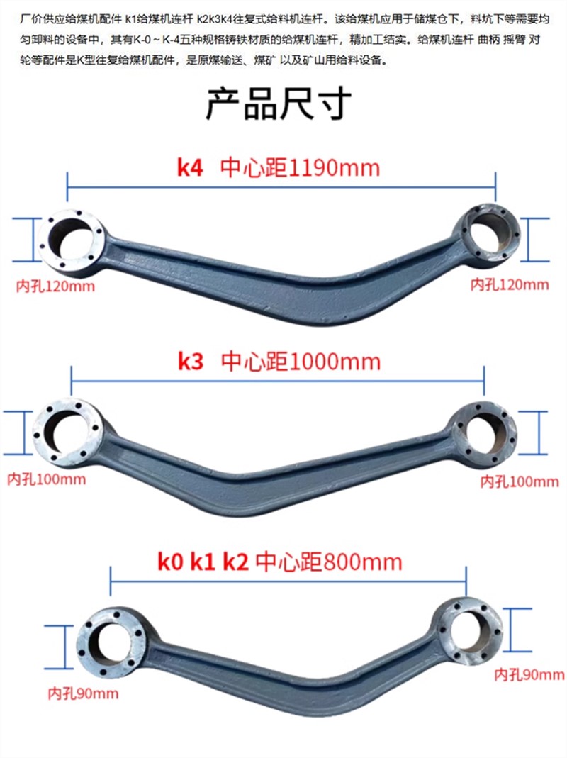 往復式給煤機曲柄連桿裝置的作用一是運動轉換,將電動機的旋轉運動轉化為給煤機底板的直線往復運動;17719958219 二是動力傳遞,把電動機輸出的轉矩轉化為使底板往復運動的驅動力;三是控制給料量,通過調整曲柄的偏心距、轉速等參數,可以改變底板的往復運動行程和頻率,進而控制給煤機的給料量。