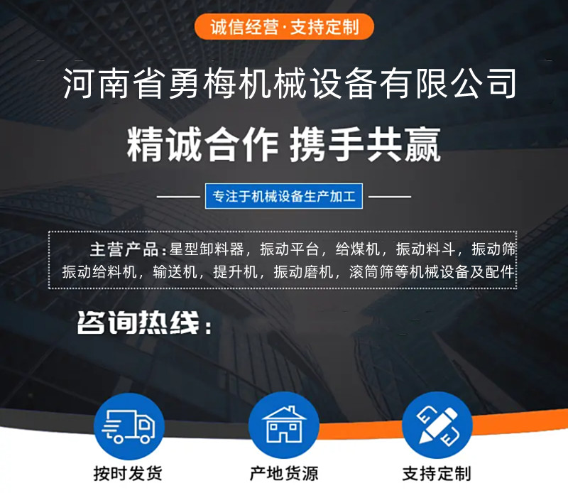 河南省勇梅機械設備有限公司位于新鄉市牧野區寺莊頂工業園內,是一家主營k型給煤機、斗式提升機、星型卸料器、振動磨機、振動平臺、振動料斗、振動篩、旋振篩、滾筒篩、直線振動篩、礦用振動篩、FU輸送機、螺旋輸送機、振動電機的廠家,產品廣泛銷售至化工、食品、鑄造、鋼廠、水泥、冶金、建材鐵等大中小型企業,并取得了良好的信譽。