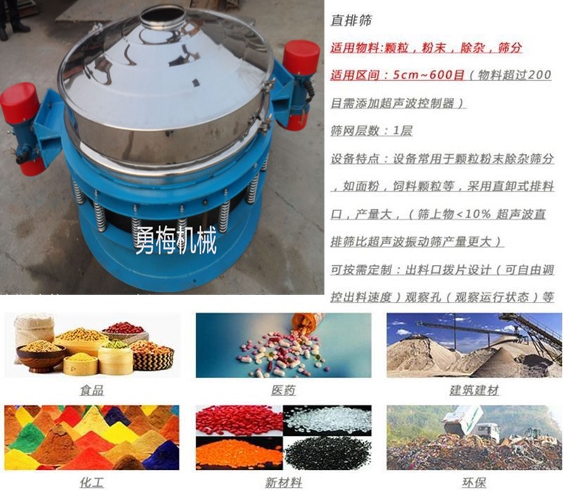 味精食鹽米粉 直排式振動篩 直排篩分機密封嚴謹,液體不泄漏,粉塵不飛揚,17719958219 可避免物料污染和環境污染。操作維護方便:體積小,不占空間,移動方便,拆裝容易,內外部易清理,無衛生死角,符合食品級 GMP 規范。直排篩由振動電機、篩體、篩網、減振裝置及座架等組成。