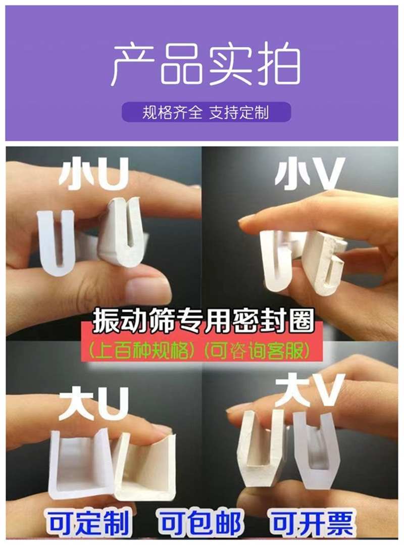 U型震動篩密封條 旋振篩密封圈不與物料發生化學反應,避免污染;即使長期使用后磨損,碎屑也無毒無害,易清理,17719958219振動篩密封條是振動篩分設備密封裝置中的一類通用基礎元件,也被稱為振動篩密封皮、振動篩密封圈等。作用:主要用于密封振動篩篩框之間的連接處,防止所篩物料流體或固體微粒從相鄰結合面間泄露,同時阻止外界雜質如灰塵、水分等侵入機器設備內部。此外,還能減輕振動篩作業中產生的振動對篩框的破壞力。