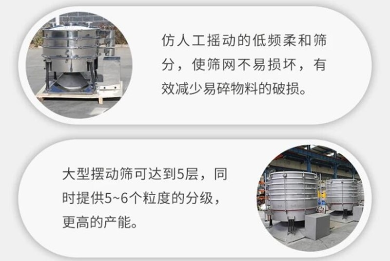 橡膠粉分級圓形搖擺篩 多層過濾振動篩可篩分至500目粒度,篩網1-5層,篩體直徑800MM~2500MM對于單一分級的產品,可以幫助您在同一臺篩子上獲得雙倍甚至更高的產能。物料從幾乎水平運動的篩體中心進料,沿螺旋曲線向外圍發散。與此同時,隨著垂直加速度的增大迫使細顆粒的產品有效透過篩網表面。