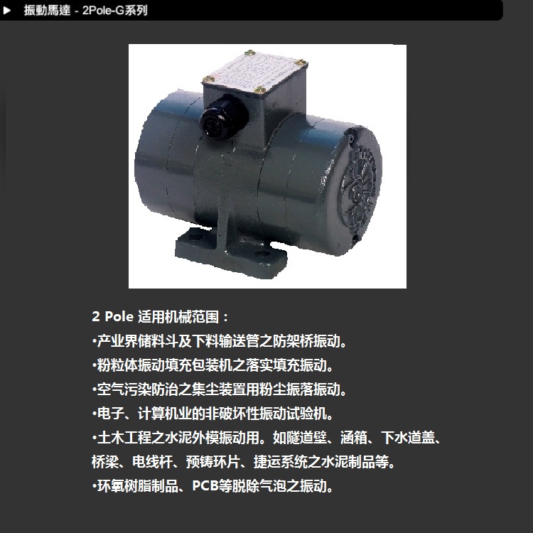 您當前位置:首頁 >> 產品庫 >> >> G-220 臥式振動電機 2 Pole-G系列 G-220振動馬達