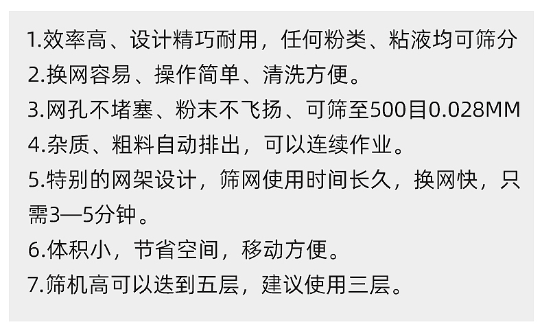 XZS型系列旋振篩是一種特殊型、高精度細(xì)粒篩分機(jī)械。適用于冶金、耐火材料、磨料、化工、染料、橡膠制品、膠木、陶瓷、農(nóng)藥、化妝品等干式、濕式及多種幾何物料的間斷、連續(xù)、干濕式各種形式篩分作業(yè)。高性能低噪音、全封閉結(jié)構(gòu),無(wú)粉塵溢散。該系列篩機(jī)可以通過(guò)各種不同目數(shù)的篩網(wǎng),把不同顆粒、粉狀物料很好地連續(xù)分離,以滿(mǎn)足各種不同需要。