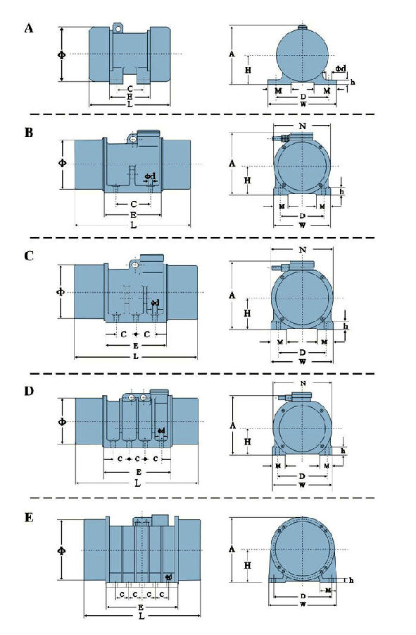 振次(轉(zhuǎn)速):HB系列振動(dòng)電機(jī)分別為2、4、6、8級(jí),振次分別為2900、1460、980、740RPM。