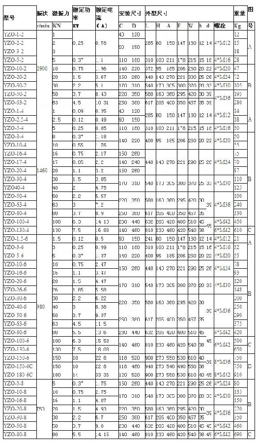YZO振動(dòng)電機(jī)技術(shù)參數(shù)