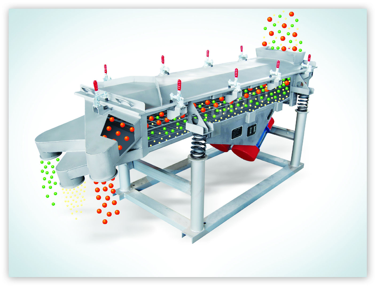 直線篩利用振動電機(jī)激振作為振動源,使物料在篩網(wǎng)上被拋起,同時向前作直線運(yùn)動,物料從給料機(jī)均勻地進(jìn)入篩分機(jī)的進(jìn)料口,通過多層篩網(wǎng)產(chǎn)生數(shù)種規(guī)格的篩上物、篩下物、分別從各自的出口排出。具有耗能低、產(chǎn)量高、結(jié)構(gòu)簡單、易維修、全封閉結(jié)構(gòu),無粉塵溢散,自動排料,更適合于流水線作業(yè) 。