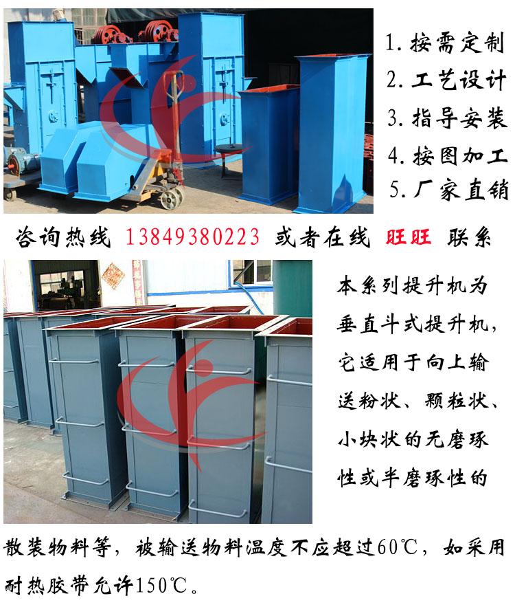 斗式提升機(jī)適用于垂直輸送松散密度1.5t/m3粉狀、粒狀、及小塊狀的磨吸性較小的散狀物料,如糧食、煤、水泥、碎礦石等,提升高度較高,物料溫度不超過(guò)60℃