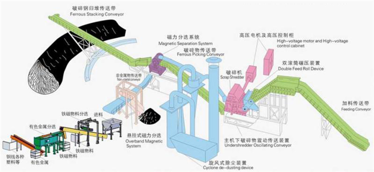 廢鋼破碎生產(chǎn)線基本設(shè)備包括:進(jìn)料鏈板輸送機(jī)、雙棍碾壓機(jī)、廢鋼破碎機(jī)、振動出料機(jī)、磁選機(jī)、皮帶運(yùn)輸機(jī)等。需要有色金屬分選的,配有有色金屬分選機(jī);需要風(fēng)力分選的加裝風(fēng)選系統(tǒng);需要除塵的配除塵系統(tǒng)。