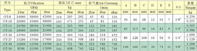 OT系列渦輪型氣動(dòng)振動(dòng)器由鋁合金殼體、金屬圓柱、渦輪及軸承等構(gòu)成,通過(guò)渦輪運(yùn)轉(zhuǎn)產(chǎn)生振動(dòng)。在運(yùn)轉(zhuǎn)過(guò)程中,可以產(chǎn)生高頻率的振動(dòng)力;即使工作在低氣流壓力下,也能產(chǎn)生很大的振幅。其運(yùn)轉(zhuǎn)需安裝雙口閥門(mén),并提供過(guò)濾壓縮空氣。該產(chǎn)品具有無(wú)需維護(hù)、潤(rùn)滑,高加速度(啟動(dòng)),離心力大、振幅大,低噪音,空氣消耗量小等特點(diǎn)。