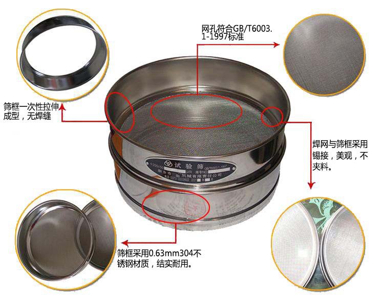 8、試驗(yàn)篩篩框采用SUS304(0Cr18ni9)不銹鋼拉伸拋光而成,壁厚0.6毫米,表面光澤均勻一致,整體成型堅(jiān)固耐用,不存在絲毫磁性, 標(biāo)準(zhǔn)篩篩網(wǎng)與標(biāo)準(zhǔn)篩篩框通過錫焊成型固定、不會(huì)產(chǎn)生松弛晃動(dòng),能耐300度以下高溫。