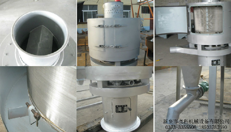本設(shè)備篩網(wǎng)為圓筒狀,置于機(jī)體內(nèi),物料通過螺旋輸送系統(tǒng)后,和氣流混合、霧化進(jìn)入網(wǎng)筒內(nèi);通過網(wǎng)筒內(nèi)風(fēng)輪葉片使物料同時受離心力和旋風(fēng)推進(jìn)力,從而迫使物料噴射過網(wǎng),由細(xì)料排出口排出,不能過網(wǎng)的物料沿網(wǎng)筒壁從粗料排出口排出。