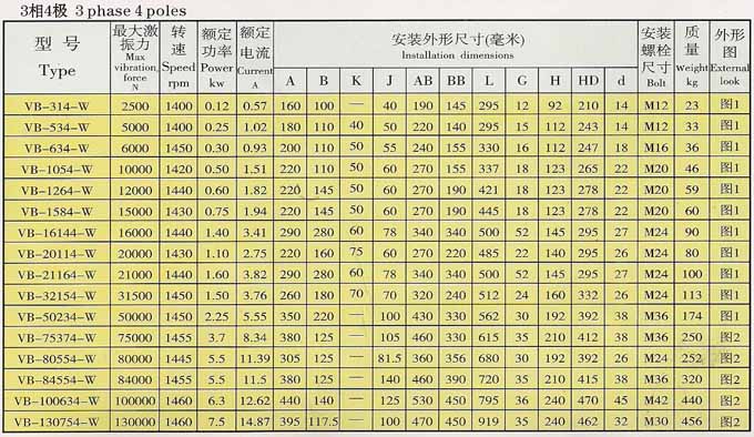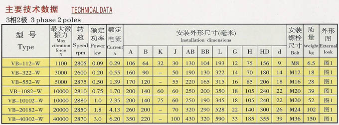 VB振動電機的各項參數(shù)和其它系列的振動電機都可以互相通用,多用于各種型號的振動篩分設(shè)備作為主要振動力來源,具體型號可參考下表。