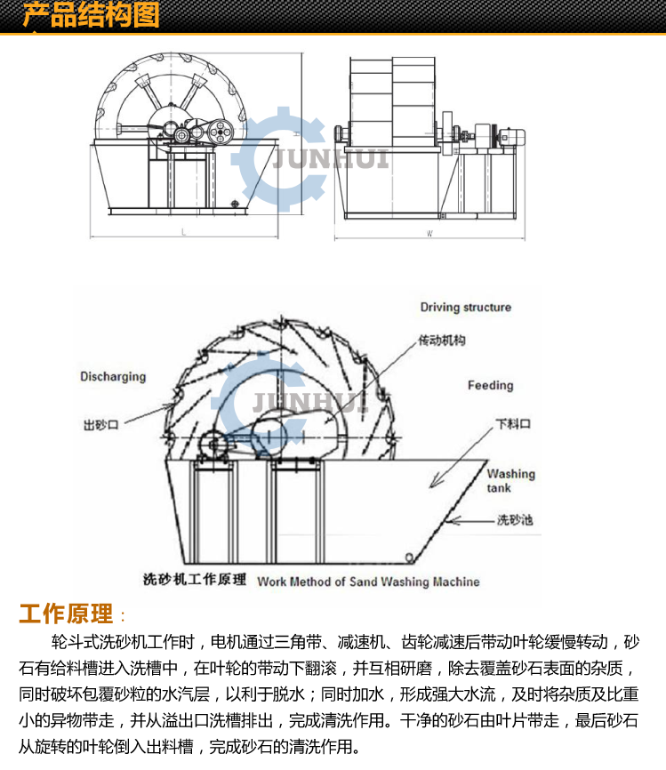 (輪斗式)洗沙機(jī)原理:將沙子用裝載機(jī)裝進(jìn)料斗,利用料斗底部的輸送帶輸送至滾筒篩,進(jìn)入滾筒篩的同時(shí)使用大水量水泵往滾筒篩里面沖水,沙子隨水經(jīng)過翻滾進(jìn)入洗沙機(jī),塊狀的物料利用滾筒篩篩出。然后利用物料比重的原理,泥水隨溢水口流出流入沉淀池,沙子經(jīng)斗式提升機(jī)控水后挖出。