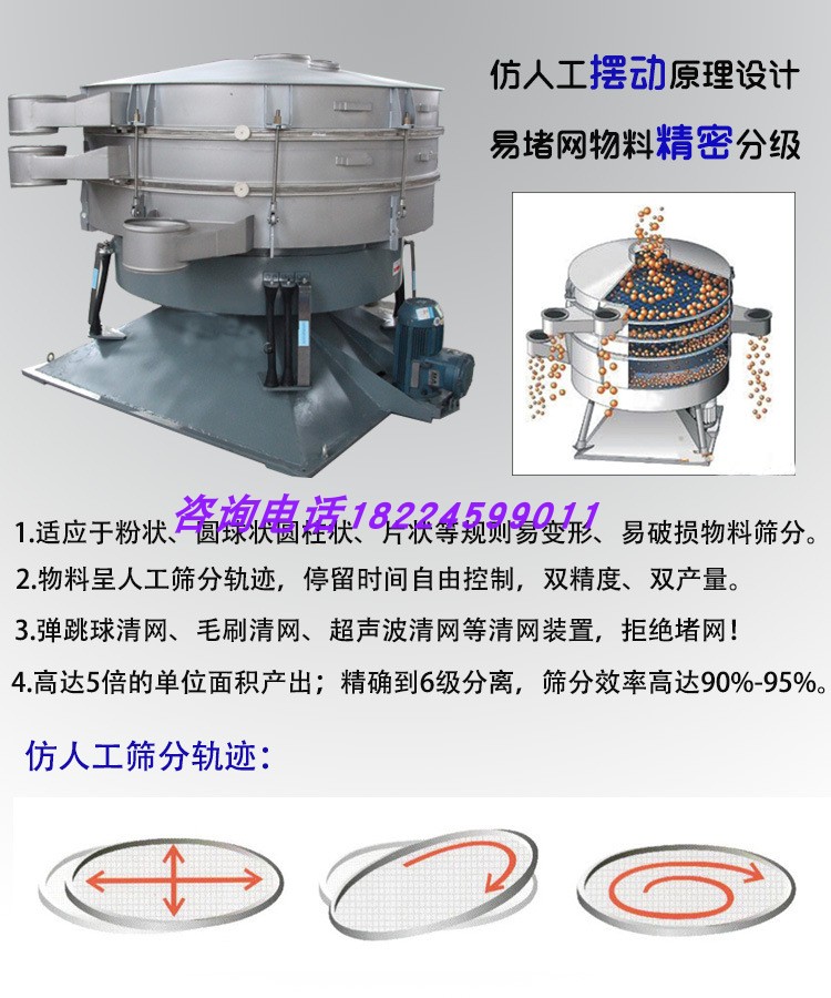 1、回旋式篩分:兩層同樣孔徑的篩網(wǎng),讓篩過一次的物料再次篩分,以達(dá)到更高的篩分精度。
