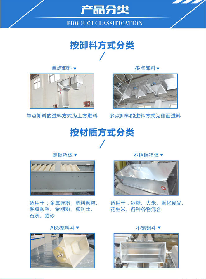 斗式提升機(jī)根據(jù)不同的分類方式,可以有不同的分類。按輸送物料的方向可以分為:垂直式斗式提升機(jī)和傾斜式斗式提升機(jī);按卸載特性分為:離心式斗式提升機(jī)、重力式斗式提升機(jī)和混合式斗式提升機(jī);按料斗的型式分為:深斗式斗式提升機(jī),淺斗式斗式提升機(jī)、鱗板式斗式提升機(jī);
