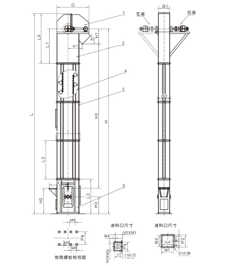 1 驅(qū)動裝置   2 上箱體   3 中間箱體   4 鏈條+斗   5 下箱體