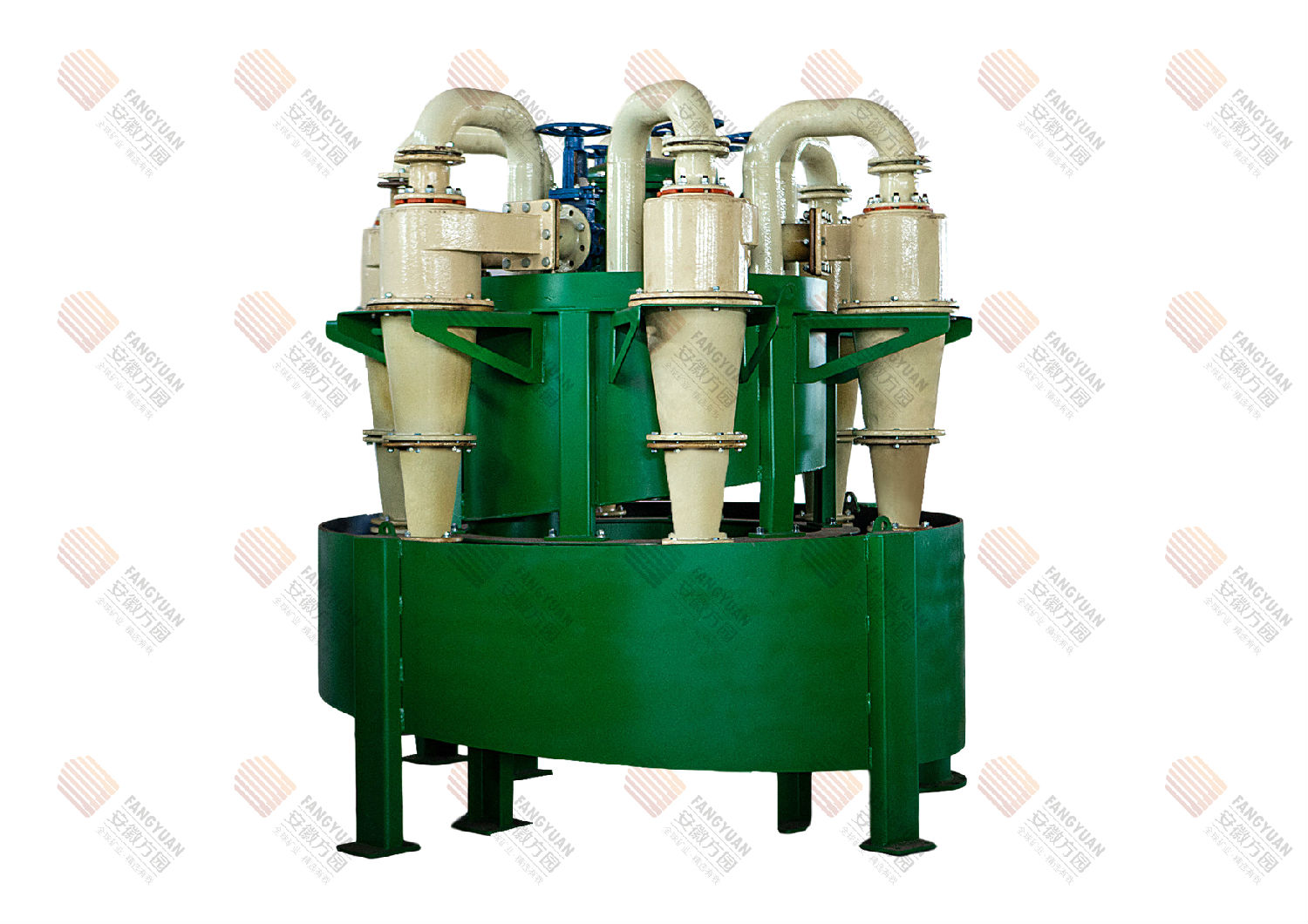 旋流器工作原理:旋流器依靠離心沉降進(jìn)行分離,將需要份額不同的兩相混合液混合液以一定的壓力從旋流器圓筒段上部的進(jìn)料口送入,從而在旋流器內(nèi)形成強(qiáng)烈的旋轉(zhuǎn)運(yùn)動,由于輕相和重相的密度差異或粗細(xì)力度之間的力度差異,所受的離心力和流體曳力的大小不同,通過旋流器溢流排除,而重相則由底流口排出。