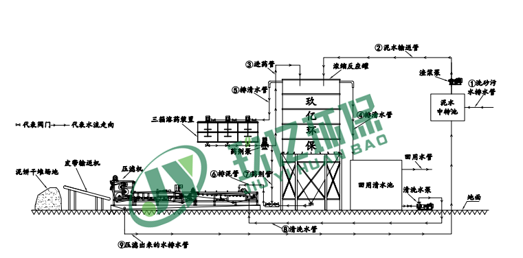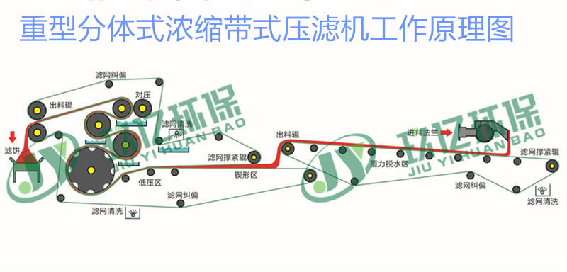 污泥經(jīng)輸送泵進(jìn)入動(dòng)(靜)態(tài)混合器,與同時(shí)參加的濃度為0.05~0.1陰(陽(yáng))離 子絮凝劑溶液相混兼并充沛反響后,渣(泥)漿中的細(xì)小固體顆粒(或懸浮物)聚凝成體積較大的絮狀團(tuán)塊,物料間的結(jié)合水及外表水被別離成自在水,當(dāng)物料被輸 送鋪展到加長(zhǎng)的重力預(yù)脫水區(qū)(或帶式濃縮機(jī)上)的濾網(wǎng)上,在重力的效果下自在水透過(guò)濾網(wǎng)反面而滲出別離,構(gòu)成不活動(dòng)狀況的污泥,到達(dá)壓榨脫水區(qū)施行*大壓 力條件,然后跟著網(wǎng)帶的移動(dòng)而夾持在上下兩條網(wǎng)帶之間,通過(guò)具有可調(diào)張緊力的過(guò)濾帶及直徑逐步遞減的轉(zhuǎn)輥和對(duì)壓輥,施行接連增加的緩慢的對(duì)輥揉捏力、剪切 力效果,通過(guò)楔形區(qū)、低壓區(qū)、中壓區(qū)、高壓區(qū)和強(qiáng)力對(duì)輥擠夾區(qū)將渣(泥)漿中的水份通過(guò)逐級(jí)增壓的方法不斷揉捏出來(lái),終構(gòu)成含水率較低的濾餅排出,通過(guò) 刮料板刮離,上下濾帶分開(kāi),通過(guò)高壓沖刷水及滾刷鏟除濾網(wǎng)外表孔隙中的微量顆粒,持續(xù)進(jìn)入下一步脫水循環(huán)。